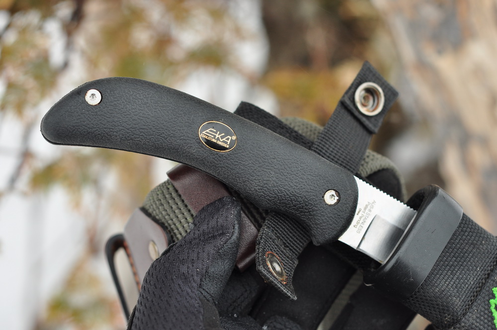 Охотничий нож – особая тема для разговора. Без ножа охотнику в лесу делать нечего. Кто-то обходится одним ножом, кто-то предпочитает иметь при себе пару специализированных инструментов для разделки. Шведы предлагают нож-перевёртыш, сочетающий в себе классический клинок с крюком для вспарывания шкуры.