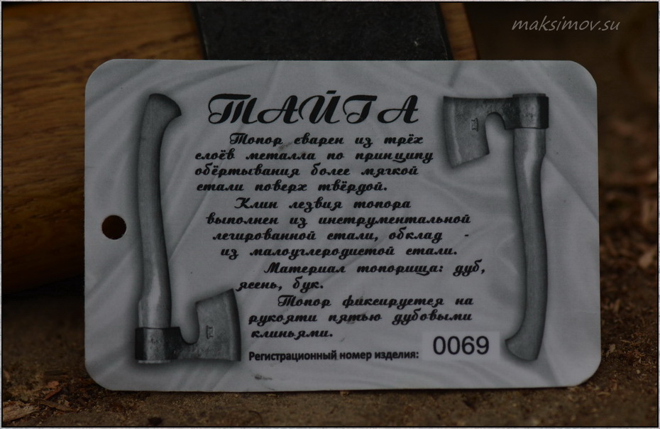 На самом топоре на запломбированной шпагатной петле была прикреплена «визитка» со всей необходимой информации об изделии. Первое же общее впечатление от упаковки и комплектации оказалось положительным. Дело оставалось за малым – проверкой работой.