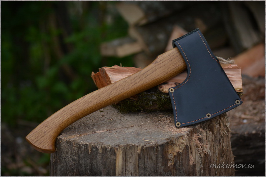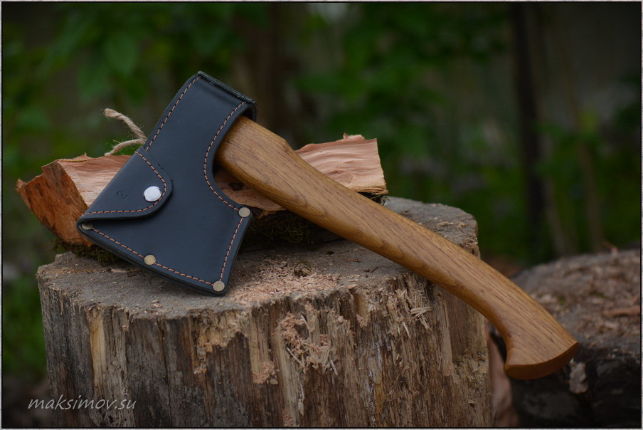 Удобный «крючок» на конце рукояти позволяет удерживать топор при работе даже влажными руками, не позволяя топору выскользнуть из рук. Мне край «крюка» показался слишком острым, в итоге с него, с внутренней стороны, была снята небольшая фаска. Как уже было упомянуто выше, рукояти на инструмент изготавливаются из твёрдых пород дерева: дуба, ясеня или бука.