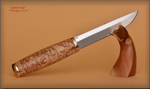 Клинок из стали К340 имеет сквозной монтаж. Рукоять выполнена из карельской берёзы, больстер и навершие - из бронзы. Нож "Норд" полноразмерный нож универсального предназначения.