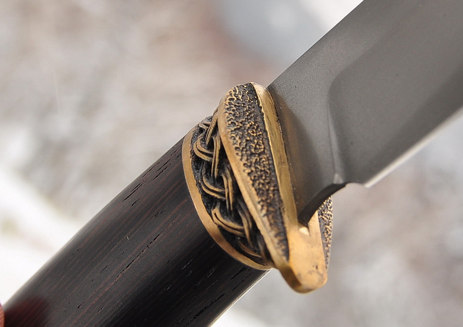 Задняя часть рукояти расширена и несколько опущена вниз, заканчиваясь плоским фигурным навершием из бронзы. Черен рукояти выполнен из редкой породы древесины, которую я пока не опознал, но дерево очень плотное и имеет интересную фактуру.