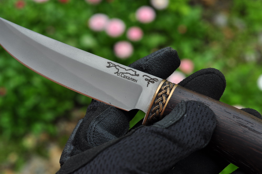 Модель 080 имеет довольно длинный и относительно узкий клинок из легированного булата (максимальная ширина 28 мм, при длине 140 мм), визуально несколько выгнутый кверху. Но в реальности обух образует с передней частью верха рукояти практически прямую линию. Монтаж клинка – всадной, на клей.