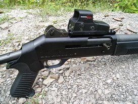 Такая схема прицела имеет как плюсы так и минусы, но прицеливание вполне комфортно, хотя быстрая стрельба навскидку требует определённого навыка и вообще – такой прицел явно не для охотничьего дробовика.