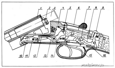 Да, согласен, что такая конструкция, обеспечивающая быстрый доступ к сломанному бойку (которые у Иж-54/26 раздельны от курков), вроде бы предпочтительнее, но не будем забывать, что ресурс у этих моделей ниже, чем у того же Иж-58, у которого бойки впрессованы в курки.