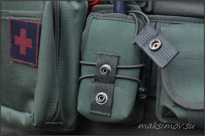 Подсумок оснащён утягивающим эластичным жгутом, позволяющим регулировать внутренний объем подсумка в зависимости от габаритов рации. Сверху радиостанцию дополнительно фиксирует страховочный жгут с фиксатором, который имеет возможность регулировки по длине.