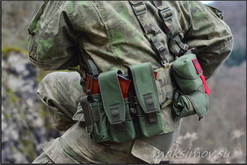 Но главное преимущество новинки, на мой взгляд, - это надёжная фиксация пояса и размещённых на нём подсумков на торсе оператора. На бандажах старой конструкции двойные подсумки с тяжёлыми магазинами под 7,62-мм патроны скручивали бандаж.