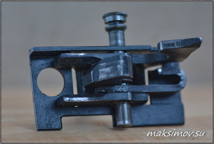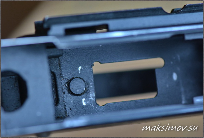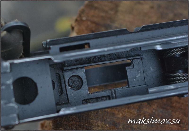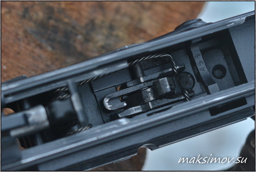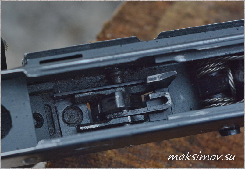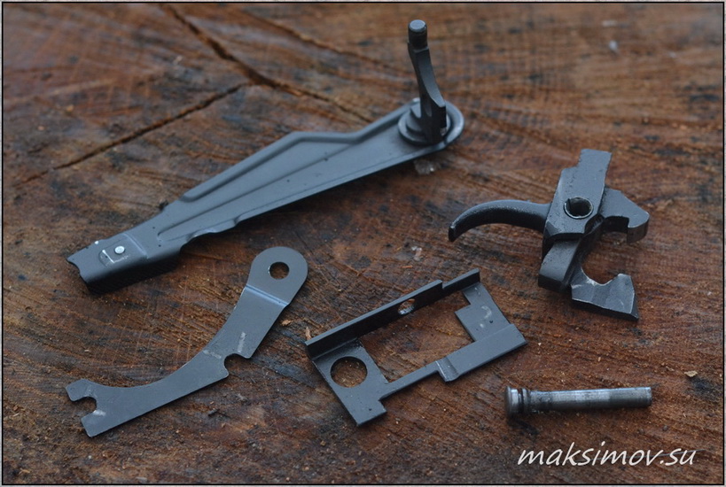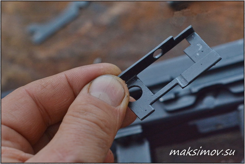 Небольшим недостатком было то, что пришлось подпиливать спусковой крючок в задней части (для прохода зуба предохранителя), т.к. спусковой крючок оказывался в немного выжатом положении, что мешало проходу предохранителя. Конечно, можно конечно «запилить» и предохранитель, но Андрей предпочёл запилить спусковой крючок. На функционал это никак не повлияло, но ход всё равно был ещё тяжеловат, т.к. пружина для удержания осей давила на пластину, а та - тёрлась о спусковой крючок.
