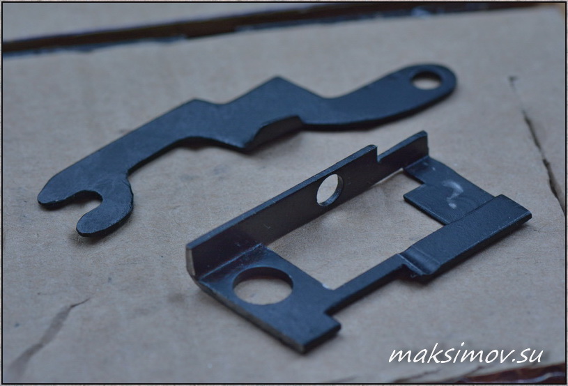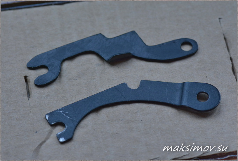 Через некоторое время Андрей приобрёл себе ещё один калашмат - ВПО 205. И тут выяснилось, что на него выстраданную приспособу не поставить, т.к. в конструкции этого оружия отсутствовала фиксирующая пружина. Пришлось увеличить нижнюю часть детали. В итоге оформился окончательный вид пластины. Ну и пришла мысль сделать на «Сайгу» пластину для удержания осей по типу ВПО, но с учётом специфической блокировки. Так и родился комплект для тюнинга УСМ калашей и различного рода АК-образных. Конечно, Андрею пришлось немало поковыряться, чтобы сделать этот комплект более-менее универсальным.