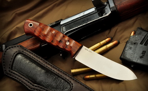 Скинер имеет цельнометаллическую конструкцию, с накладками из очень интересного дерева с берегов далёких экзотических стран - кокоболо. Фигурные плашки рукояти закреплены на пластине клинка клёпкой и развальцованной темлячной трубкой. Нож сконструирован для длительной и интенсивной работы, чему способствует грамотно сделанная и оттого очень удобная рукоять.