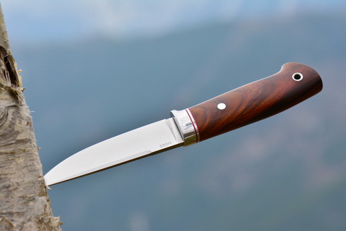 Материалы так же подобраны на достойном уровне: сталь клинка м390, рукоять из кокоболо, ножны хотя и простой классической конструкции, но пошиты из хорошей кожи и очень тщательно.