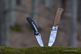 Теперь о НСК «Стерх». Когда-то у меня был нож с фиксированным клинком с таким же названием. Нож был хороший, но оказался случайно утерянным. Поэтому складень с таким же названием и схожей конфигурацией клинка вызвал ностальгические чувства. При раскладывании НСК «Стерх» становится довольно крупным 200-граммовым ножом с мощным клинком. Общая длина разложенного ножа - 234 мм., длина клинка - 104 мм. Толщина клинка в обухе - 3,55 мм. Спуски от обуха, прямые, сведение – около 1 мм. Материал клинка - стойкая к коррозии японская сталь AUS-8. Нож имеет линейный замок и рукоять из кавказского ореха. На мой взгляд, это неплохой нож, годный для разделочных работ и претендующий на некую универсальность.