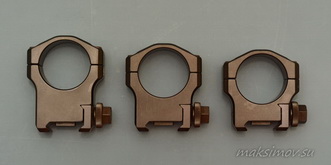 Тело кольца, верхнее полукольцо и прижимной элемент сделаны из высокопрочного алюминия В95. Это один из лучших материалов для изделий такого рода. Все детали колец фрезеруются на оборудовании МЗВО и дополнительно обрабатываются галтовкой. Допуск на важные размеры - две сотых доли миллиметра. Это высокий показатель. На внутренней стороне полуколец сняты фаски – чтобы при демонтаже колец с прицела на его корпусе не оставалось следов.