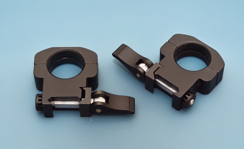 Первые впечатления положительные – кольца массивные, выглядят солидно, в «тактическом» стиле. Сделаны качественно. Проще говоря, они отнюдь не ажурные. Полукольца стягиваются четырьмя стальными винтами М4, 5-мм в сечении стопор также сделан из термообработанной стали, быстросъёмные элементы выполнены из лёгкого сплава. Несомненный интерес вызывает конструкция фиксации колец на планке, заимствованная с хорошо показавшего себя узла крепления прицела ПСУ. На рычаге механизма фиксации кольца расположен небольшой стопор. С противоположной стороны основания кольца есть ещё один стопор, в виде стального штифта. Он фиксирует гайку, с помощью которой регулируется усилие затяжки при монтаже кольца на планку Вивер. Как видно на фото, гайка имеет соответствующие выточки, по типу регулирующей гайки в конструкции кронштейна прицела ПСО-1, также выпускаемого НПЗ (в т.ч. – в качестве гражданского варианта ПО 4х24).