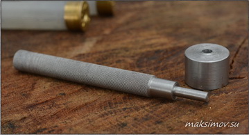 Проблема ясна, приступаем к её решению. Корректор от Ивана Кана прост конструктивно, эффективен и надёжен. Берём декапсюлированную гильзу, ставим её на наковальню. Обращаем внимание на то, что специальный бортик, выступающий за «зеркало» наковальни, должен быть направлен вверх, к донцу гильзы. Далее вставляем в гильзу стержень с направляющей иглой и один-два раза бьём по нему 0,5-1 кг молотком. Бьём аккуратно, но резко и достаточно сильно. Извлекаем гильзу, осматриваем донце. Бортик наковальни должен зачеканить металл, уменьшив внутренний диаметр капсюльного гнезда. Проверить результат можно целым капсюлем.