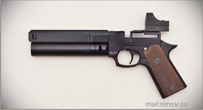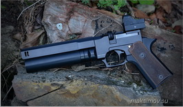 Теперь обо всём по порядку. Габариты пистолета: длина - 365 или 305 мм, высота -140 мм, масса - от 800 граммов до 1 кг (в зависимости от длины ствола и типа применяемого резервуара). Основной материал пистолета - термообработанный алюминий Д16Т, анодированный в чёрный глянцевый цвет. Пистолет собран с минимальными допусками на винтах с головками под «шестигранник». Сменная рукоятка пистолета может быть выполнена в одном из двух решений: эргономическая деревянная или алюминиевая с деревянными вставками. Внимательный читатель сразу увидит сходство второго варианта рукояти с легендарным пистолетом Кольта обр. 1911 г. Внешне такое дизайнерское решение гармонирует с остальной частью пистолета, выглядит весьма симпатично и однозначно узнаваемо. Максимальная толщина рукояти 29 мм, ширина – от 49 до 53 мм. Расстояние от спускового крючка до тыльной части рукояти – 73 мм.