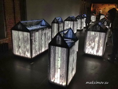 Оформление ещё одного зала. Экспозиции в виде стилизованных гробов с мрачной эффектной подсветкой.