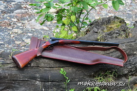 Итак, кейс представляет собой один из вариантов чехла для двустволки, только формованный из толстенной кожи. Внутри кейс отделан искусственным мехом, отлично предохраняющим ружьё от механических повреждений. Стволы отделяются от колодки с прикладом длинной вставкой с кожаным наконечником, за который из глубины кейса легко вытягиваются стволы.