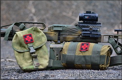 Фото слева: носилки в свёрнутом виде и пустой подсумок