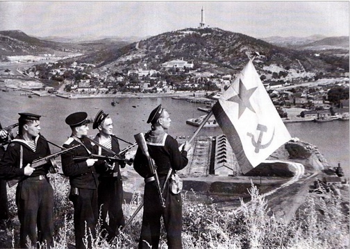 Моряки Тихоокеанского флота водружают флаг ВМС СССР над бухтой Порт-Артура. 25 августа 1945 года