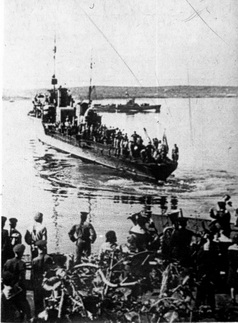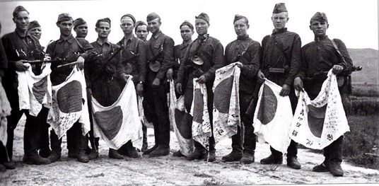 Самурайские флаги в руках советских бойцов. Р.Сунгари, август 1945 года