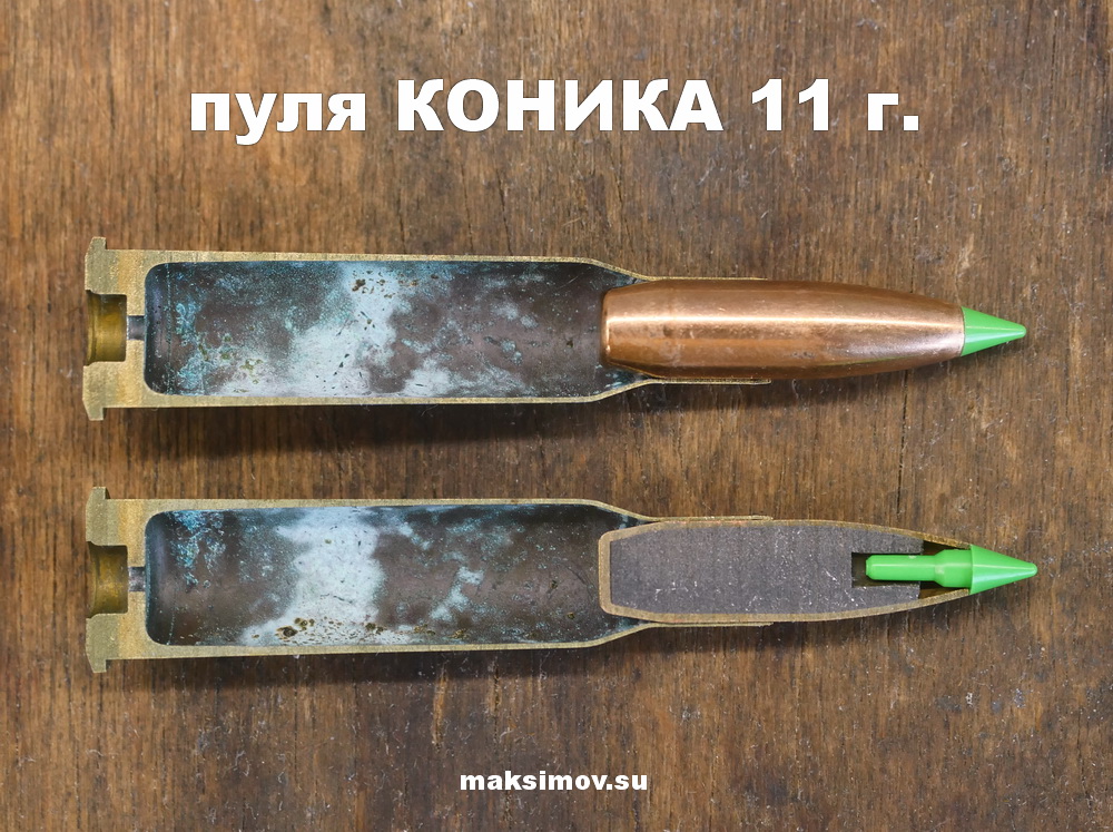 Новую пулю назвали Коника. Это классическая пуля типа BT (Boat Tail) в томпаковой оболочке из сплава Л90 со свинцовым сердечником с коническим сужением в задней части.